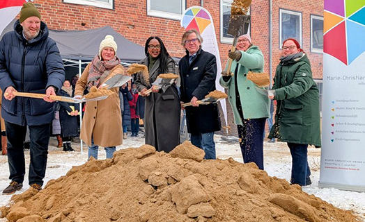 Am 20. Februar wurde in der Muhliusstraße 87/89 in Kiel der symbolische Spatenstich für das inklusive Wohn- und Assistenzangebot „Muhliushof“ gefeiert. Zu diesem Anlass hatte der Marie-Christian-Heime e. V. eingeladen. Auch Vorstandsmitglied Marko Pabst nahm an der Veranstaltung teil, denn die GEWOBA Nord ist für die bauliche Umsetzung verantwortlich. Gemeinsam mit der schleswig-holsteinischen Sozialministerin Aminata Touré gab er den offiziellen Startschuss für das Bauprojekt.